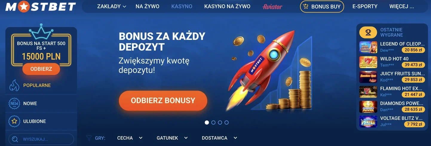 Nowi użytkownicy MostBet mogą aktywować bonus powitalny do 3000 PLN, a w wariancie kasynowym dodatkowo free spiny. Wybór pakietu następuje przy rejestracji i pierwszym zasileniu konta – możesz postawić na dopłatę do pierwszej wpłaty w sporcie albo bonus kasynowy z darmowymi spinami. Promokod jest uwzględniany automatycznie przy przejściu z odpowiedniego linku, więc nie musisz wpisywać go ręcznie.